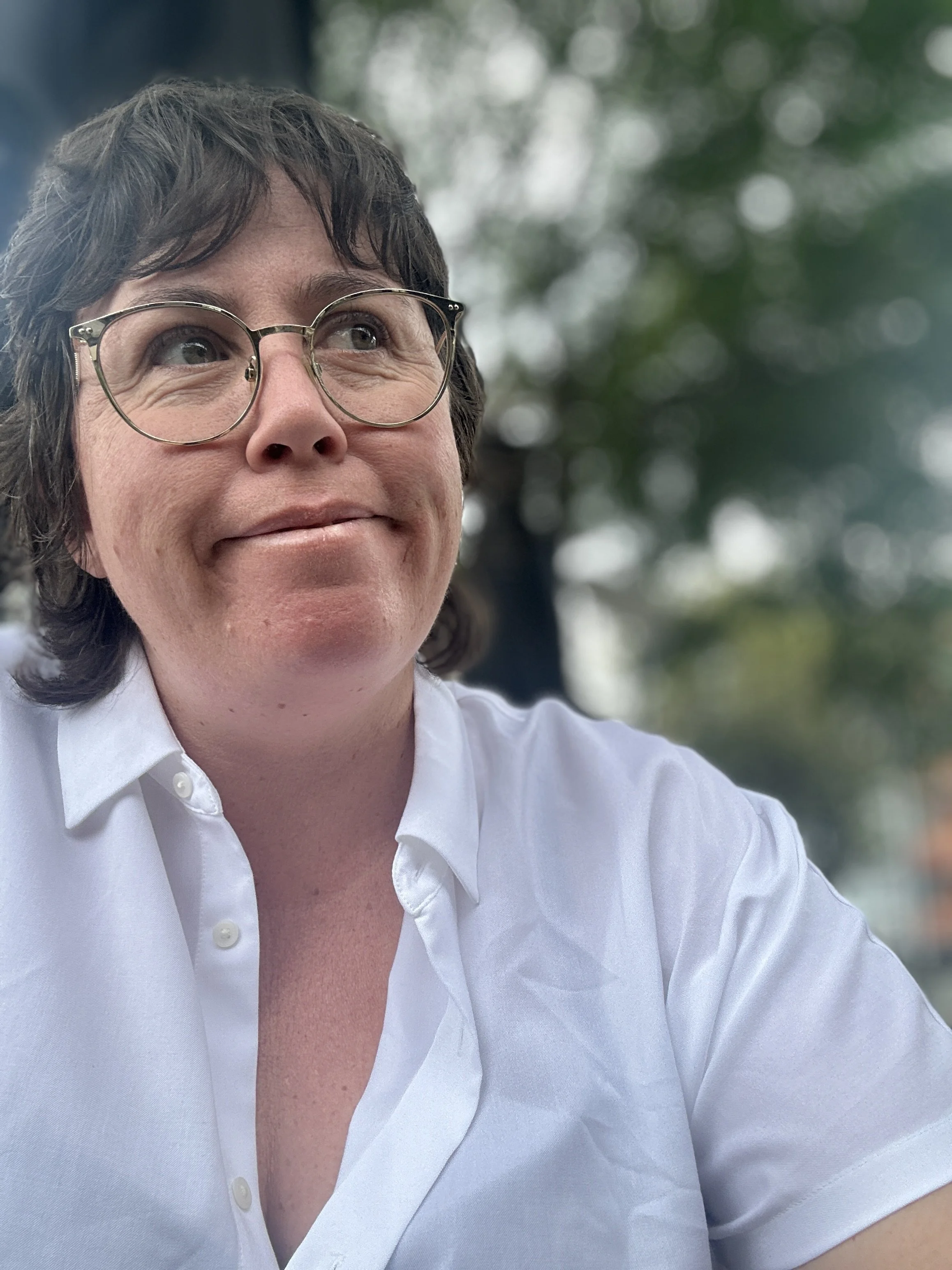 Visual description: a selfie of a person in an outdoor setting, taken from below. They are in their 30s and have an oval face, medium-fair skin, and short wavy brown hair with a fringe. They wear gold metal framed glasses and a white collared short sleeved shirt with the top buttons open. They are looking up and off to their left with a faint grin.